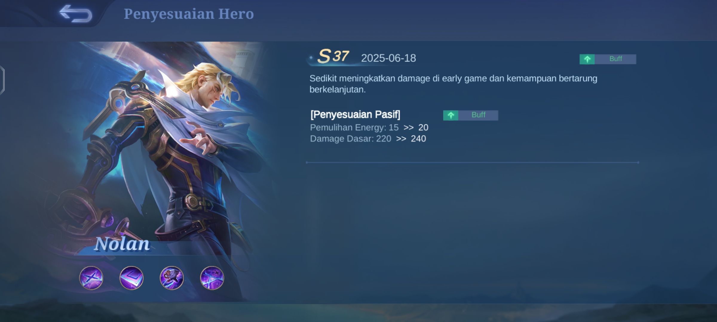 Perubahan spesifik yang diterapkan mencakup peningkatan energi pasif dari nilai awal 15 menjadi 20, yang memungkinkan hero ini bertahan lebih lama di medan pertempuran, serta kenaikan damage dasar dari 220 menjadi 240, yang secara signifikan meningkatkan kekuatan serangan dasarnya.
