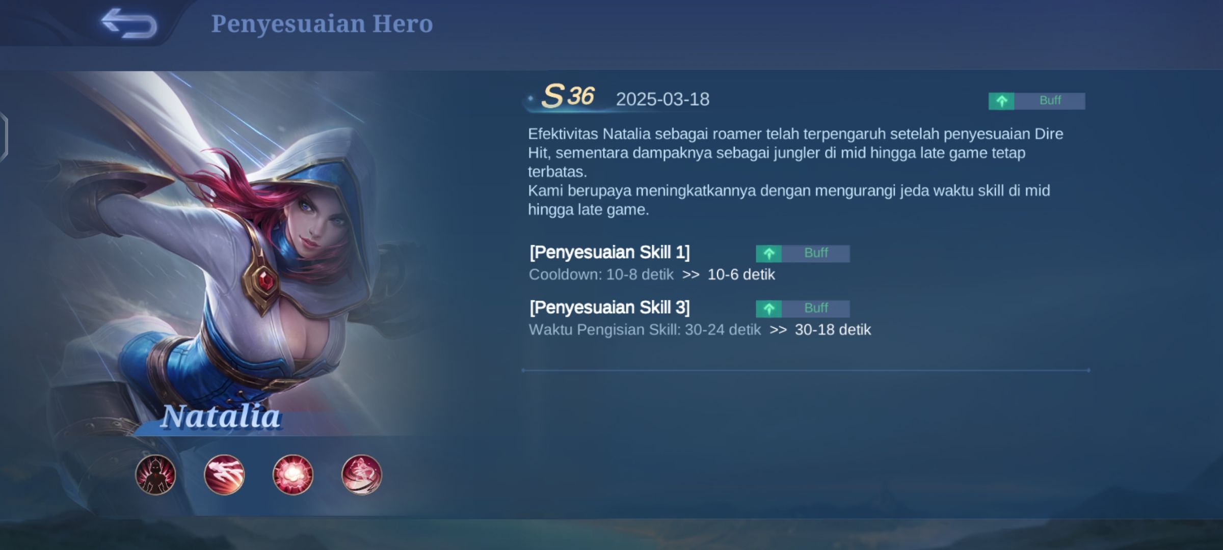 Natalia juga tak luput dari perhatian pengembang, dengan buff penting yang diimplementasikan dalam patch S36 yang diluncurkan pada 18 Maret 2025. Tujuannya adalah meningkatkan efektivitas Natalia sebagai assassin, terutama dalam hal mobilitas dan kemampuan serangnya, sehingga ia dapat menjadi ancaman nyata di fase mid hingga late game.