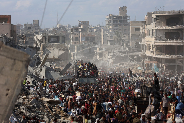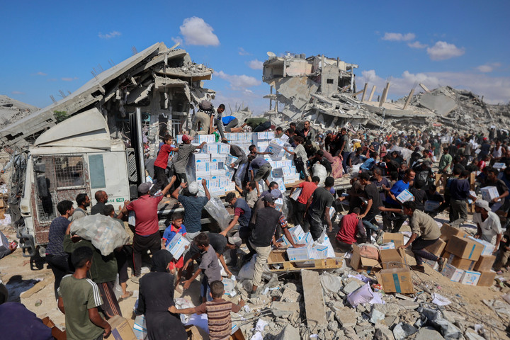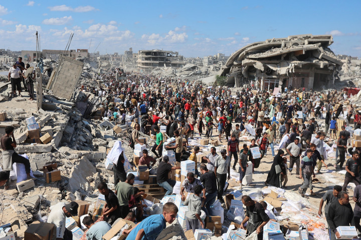 Warga berbondong-bondong menuju truk bantuan yang memasuki Khan Younis di Jalur Gaza pada Minggu (12/10). Kedatangan truk bantuan langsung diserbu warga Palestina di Gaza.