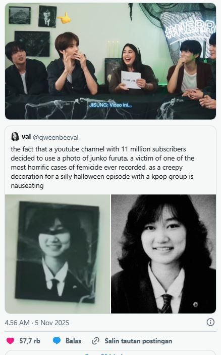 Korban dari salah satu kasus femisida paling mengerikan dalam sejarah, sebagai dekorasi menyeramkan untuk episode Halloween yang konyol bersama grup KPop, itu benar-benar menjijikkan," tulis akun @qweenbeeval dikutip , Kamis (6/11/2025).
